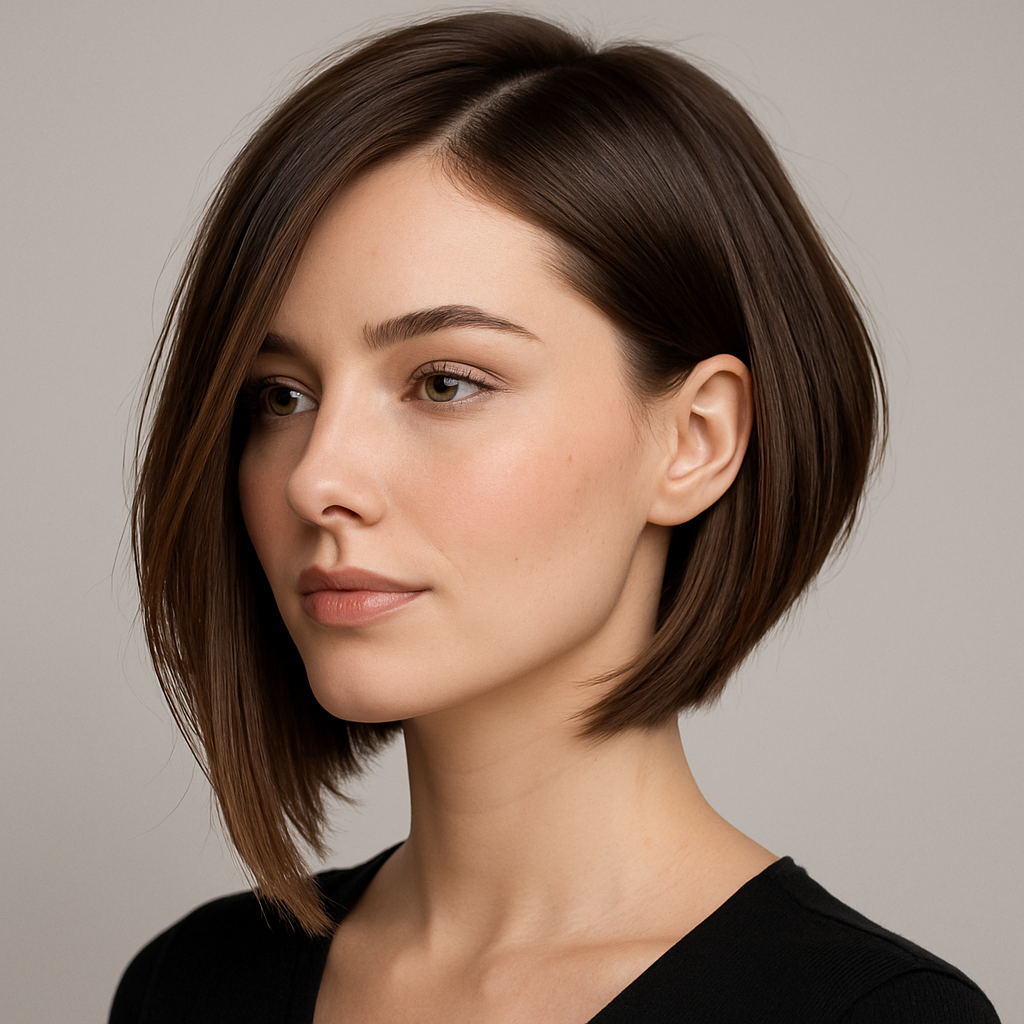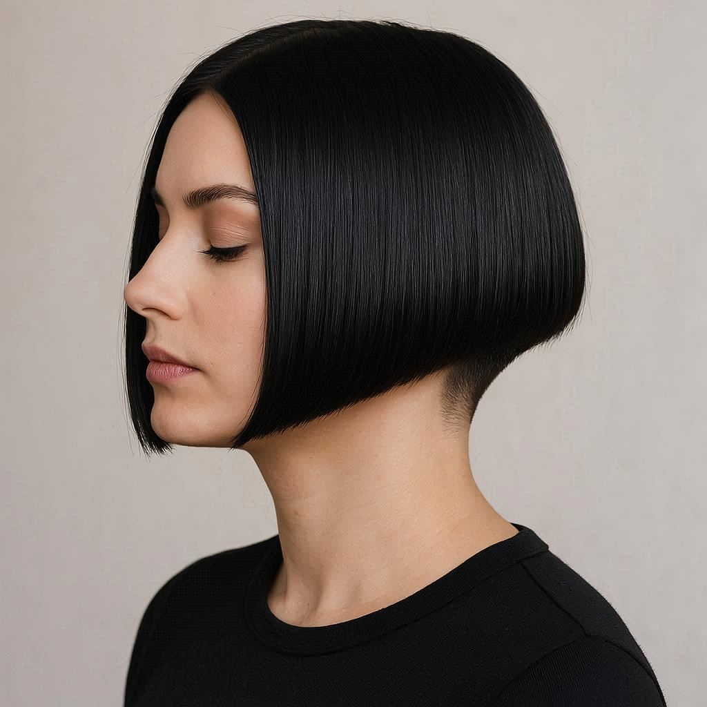 A sharp, chin-length bob with a subtle taper at the nape for a modern twist.
