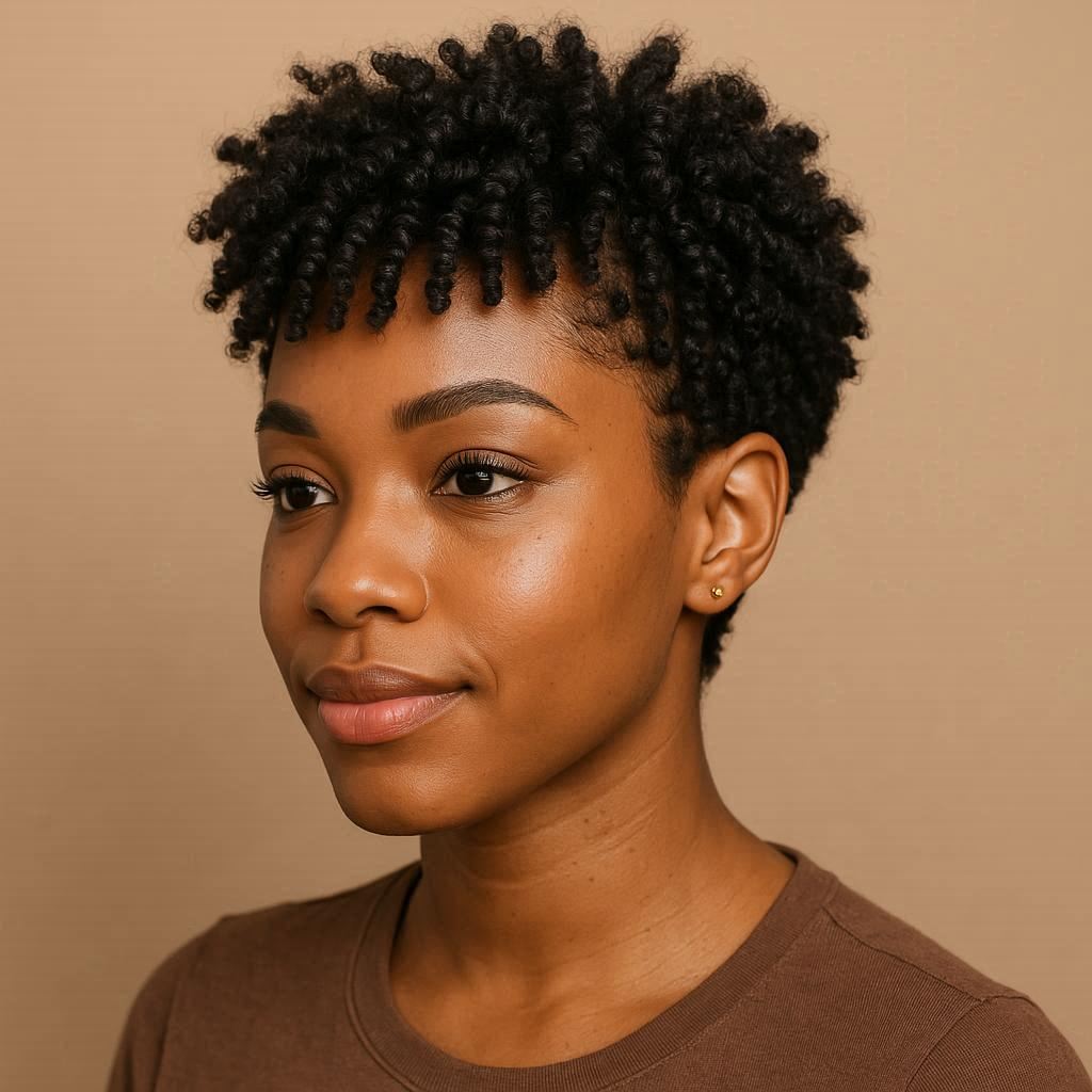 Designed for natural hair, this style keeps curls bouncy on top while tapering neatly at the back.